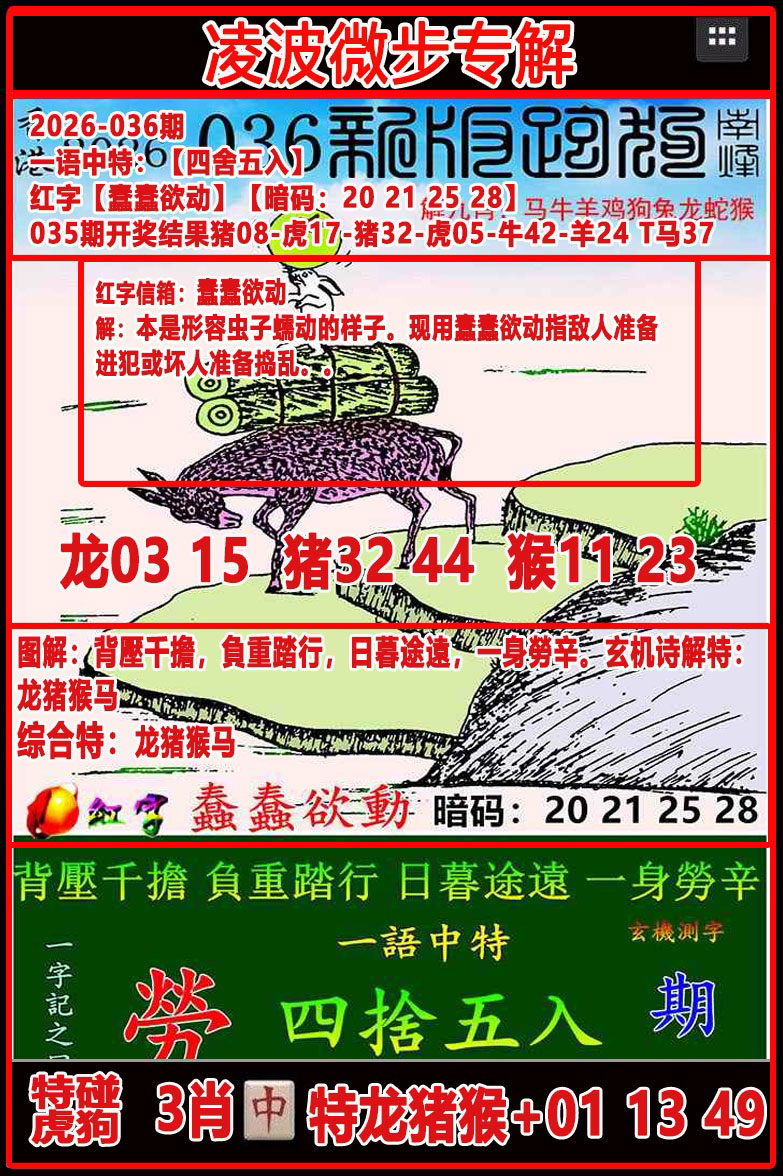 解析:红字:鍥而不舍,锲带"钅"解金肖猴鸡;舍谐音"蛇"。【释义】不断地镂刻。比喻持之以恒,坚持不懈。解重开上期的鼠或解倔脾气的牛。