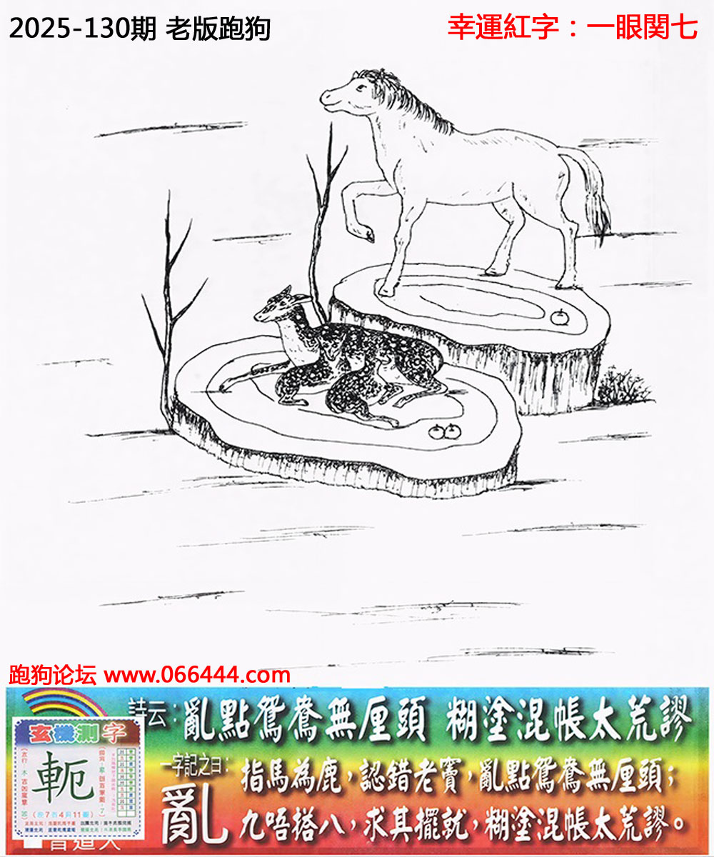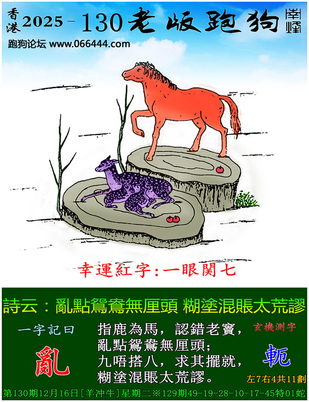 130期老版跑狗一字記之曰:【亂】 詩雲:亂點鴛鴦無厘頭,糊塗混賬太荒謬。 指鹿為馬,認錯老實,亂點鴛鴦無厘頭; 九唔搭八,求其擺就,糊塗混賬太荒謬。 玄機測字:《軛》