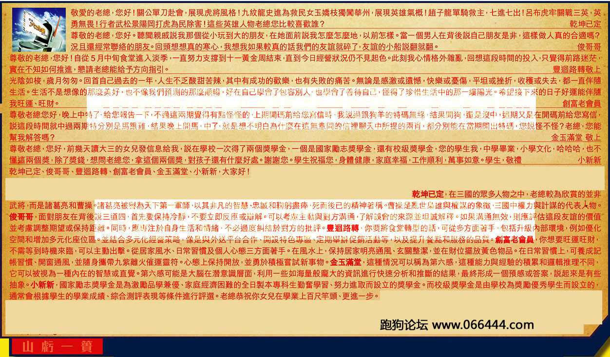【5】.尊敬老總您好,晚上中特了,給您報告一下,不過這兩期覺得有點怪怪的,上期開碼前給您寫信時,我說過跟狗羊的特碼無緣,結果開狗還是沒中,這期又是在開碼前給您寫信,說這段時間就中過兩期特分別是馬跟雞,結果晚上開馬,中了,就是想不明白為什麼在這無意間的信裡聊天中所提的兩肖,都分别能在當期開出特碼您說怪不怪?老總,您能幫我解答嗎? 金玉滿堂敬上